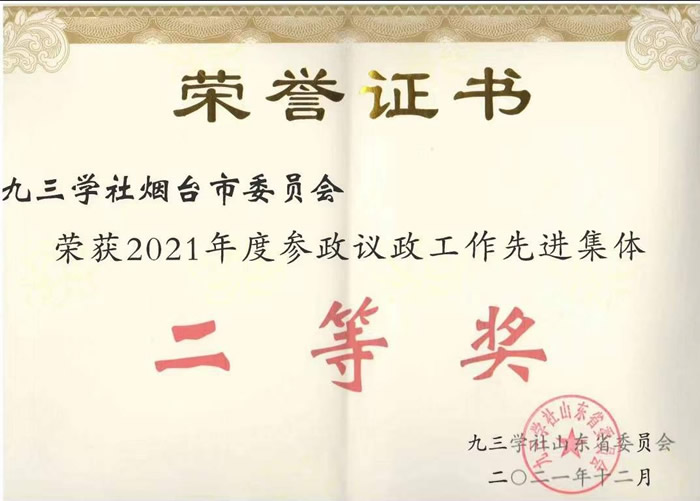 社市委荣获九三学社山东省2021年度参政议政工作先进集体二等奖。