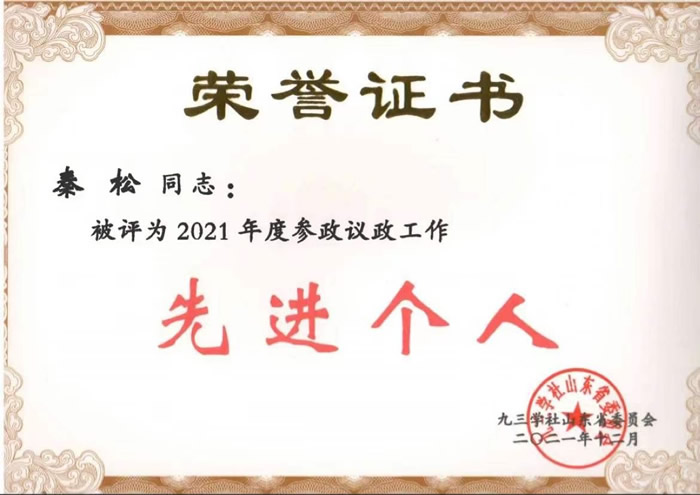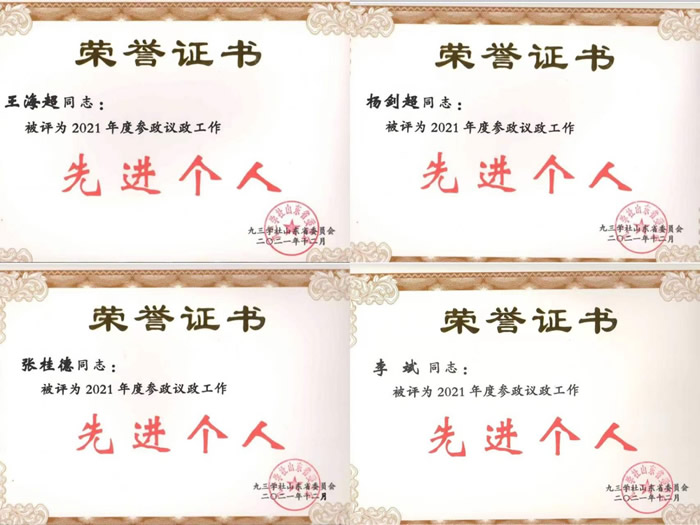 王海超、杨剑超、张桂德、李斌、李文军、刘爱英、秦松(排名不分先后)被评为九三学社山东省2021年度参政议政工作先进个人称号。