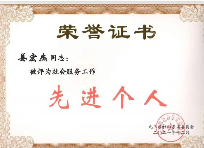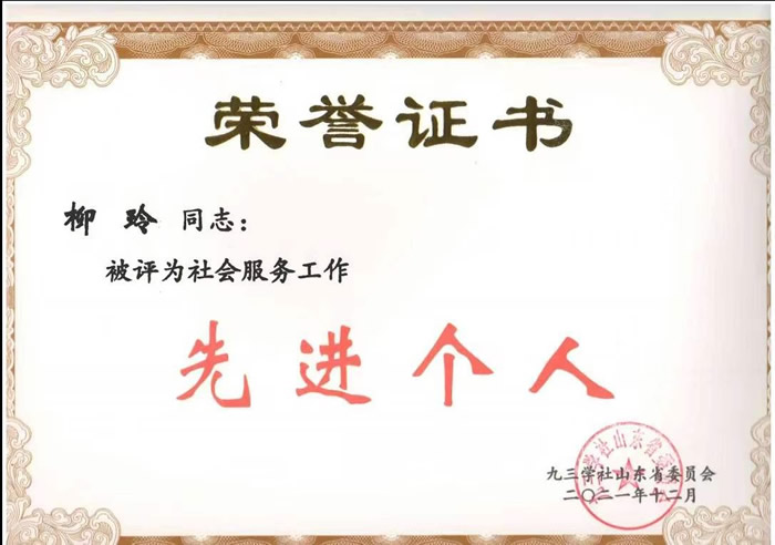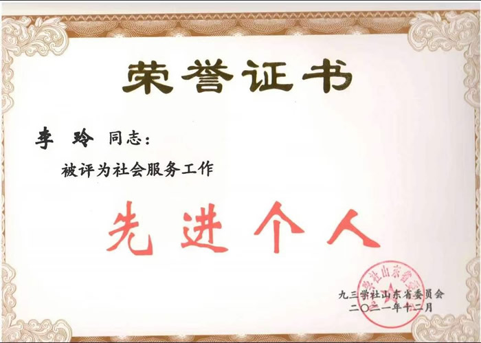 李玲、姜宏杰、柳玲(排名不分先后)被评为九三学社山东省2021年度社会服务工作先进个人。
