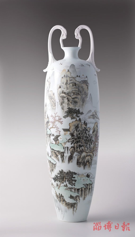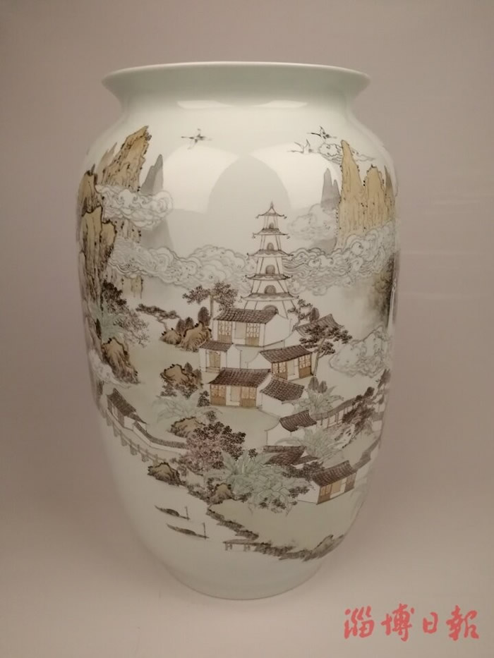 在陶瓷艺术瓶型上作画,绘画需与器型紧密结合,并受颈细腹粗的形体制约。随着瓶身的转动,还要考虑移步易景的效果,画面之间如何实现顺畅地起承转合,以求得画面内容和器型的和谐完美融合。贾伟醉心于这样的尝试,在中国传统的国画山水与陶瓷装饰的结合与创新方面,他有自己坚持的方向和独特的感悟。