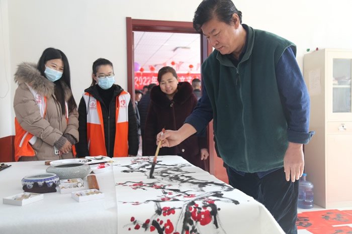 活动中,各位书画家挥毫泼墨,书写迎春“福”字和虎年春联,一并向村两委赠送了六尺长条“红梅迎春”国画和“为人民服务”书法条幅,应村民意愿书写“厚德载物”“家和万事兴”等家规家训并郑重地用上印章。整整3个小时的活动时间,多位书画家忙碌地水都顾不上喝,300余福字、春联、书法条幅和国画作品呈献给了这个寒国故里的小村庄,迎春的喜悦洋溢在村民的脸庞。活动期间,还向困难群众和老党员捐赠了价值3400余元的餐具套装、调料套盒、山区蜂蜜和花生油,体现了精神与物质的双重慰问。寒亭区广播电视台采访报道。(九三学社潍坊市委 孙三鹏)
