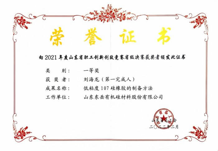 2022年2月21日,山东省职工创新创效动员大会在山东大厦影视会议厅召开,刘海龙因为其创新成果《低粘度107硅橡胶制备方法》,荣获全省职工创新创效竞赛一等奖。本次获奖成果第一完成人均为一线创新人才,均在生产一线中得到广泛应用,创造了良好的经济效益。(九三学社淄博市委 王靓)