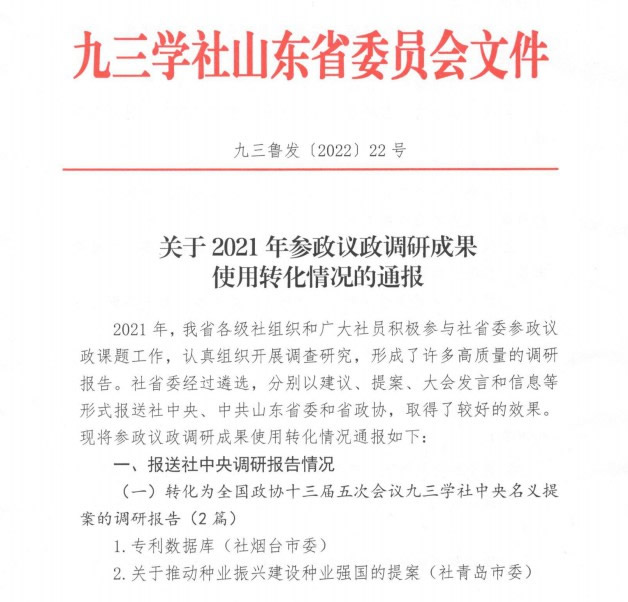 2021年,九三学社烟台市委员会及烟台市社员积极申报并承担省级以上参政议政课题,并自主报送多项参政议政成果。近日,社省委印发通报,九三学社烟台市委员会省级以上成果转化情况良好,其中三项成果被作为九三学社中央或九三学社界别集体提案向全国政协提交。具体情况如下: