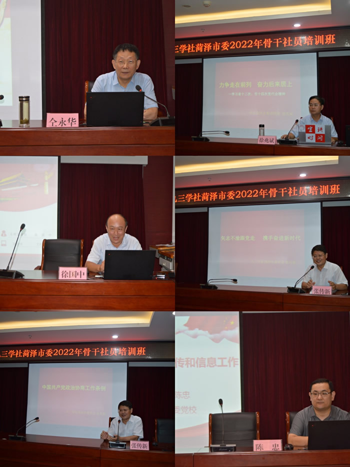 培训班根据社员实际需求,安排了内容丰富的课程。中共菏泽市委党校副校长仝永华教授以《学习党的十九届六中全会精神》为题作专题辅导;中共菏泽市委讲师团副团长徐兆斌围绕中国共产党山东省第十二次代表大会精神和中国共产党菏泽市第十四次代表大会精神作专题辅导;东明县政协副主席徐国中同志以《撰写“高言值”“有价值”的社情民意信息之我见》为题进行专题辅导;中共菏泽市委统战部宣调科科长陈忠围绕《如何做好统战理论调研宣传和信息宣传工作》作专题辅导;社菏泽市委副主委张传新以《矢志不渝跟党走、携手奋进新时代》为题为大家上了一堂生动的社史课,张传新副主委还带领大家集体学习了《中国共产党政治协商工作条例》。