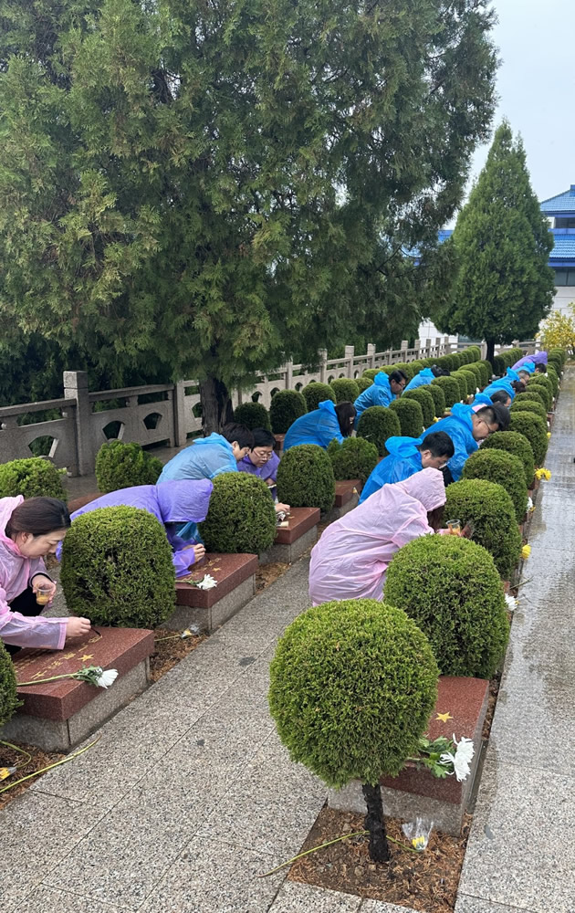 虽然一块墓碑需要描二十到三十分钟,但是大家感觉特别有意义,大家在雨中描金的同时感受到了烈士们无声的爱国主义情怀,脑海中浓烈的思想在碰撞、在净化,眼眸中晶莹的泪花止不住的在跳动,伴随着雨水已经分不出你我。