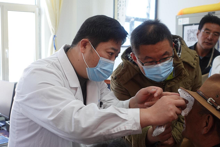 14日,初冬的刚察气温已达到-10℃,但听说聊城专家又来了,在刚察县人民医院五官科的走廊里一早就挤满了前来筛查的患者。检查现场,医疗队专家通过测眼压、电脑验光、裂隙灯、AB超、发眼药水、讲解用药,有条不紊的按照标准、规范化流程进行,为眼科患者进行术前检查。经过一天紧张有序的筛选,共为百余名患者做了详尽的检查,最终选定了50余名符合手术条件的患者。15日,李忠庆及医疗团队按照计划开始有序地对患者进行白内障和翼状胬肉手术。冬日的刚察,氧气愈发稀薄,为加快手术进度,减少患者家属等待时间,专家们忍着高原反应带来的不适,主动放弃午休时间,利用十几分钟的时间吃过盒饭后按照手术排期,规范有序地进行手术,当日的手术从上午一直持续到晚上7点多才结束,共完成白内障手术27台、翼状胬肉手术6台。16日,医疗 队为已完成手术的27台白内障和6台翼状胬肉手术的患者进行复查后,又加班加点完成白内障手术18台、胬肉手术3台,满足手术条件的患者全部得到诊治。96岁的卓玛(化名)是本次“青海刚察复明行”中年龄最大的患者,当术后视力得到有效恢复后,一家人激动地握着医护人员的手,感激他们帮助老人“重获新生”。63岁的盎贝(化名),近段时间他感到双眼逐渐模糊,视物不清,只能用耳朵分辨事物,当揭开纱布的那一刻,他对首次见到“庐山真面目”的山东专家连声称赞!