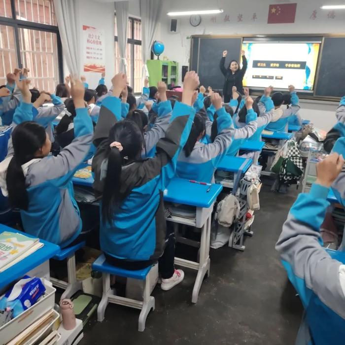 九三学社社员、济南外国语学校音乐教师杨柳青带领学生学习了汉族民歌的劳动号子,教室外的细雨朦胧,与教室内的学生热情似火的歌声相得益彰。