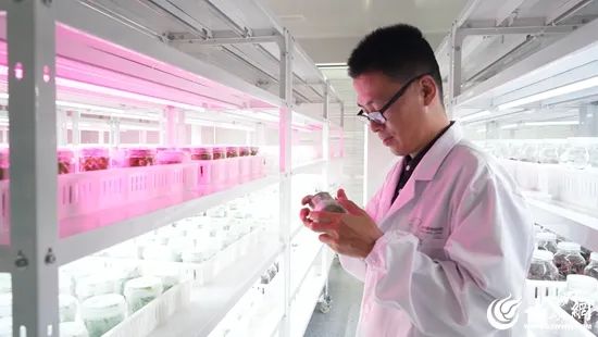 在丰沃现代农业产业园内,种植着数万棵果树,与传统栽培方式不同的是,这里的果树都是从实验室中培育出来的。在组培实验室外,透过培养室的玻璃窗,培养架上摆满了玻璃瓶,一个个绿色小芽正在瓶里扩繁、生根,发芽。
