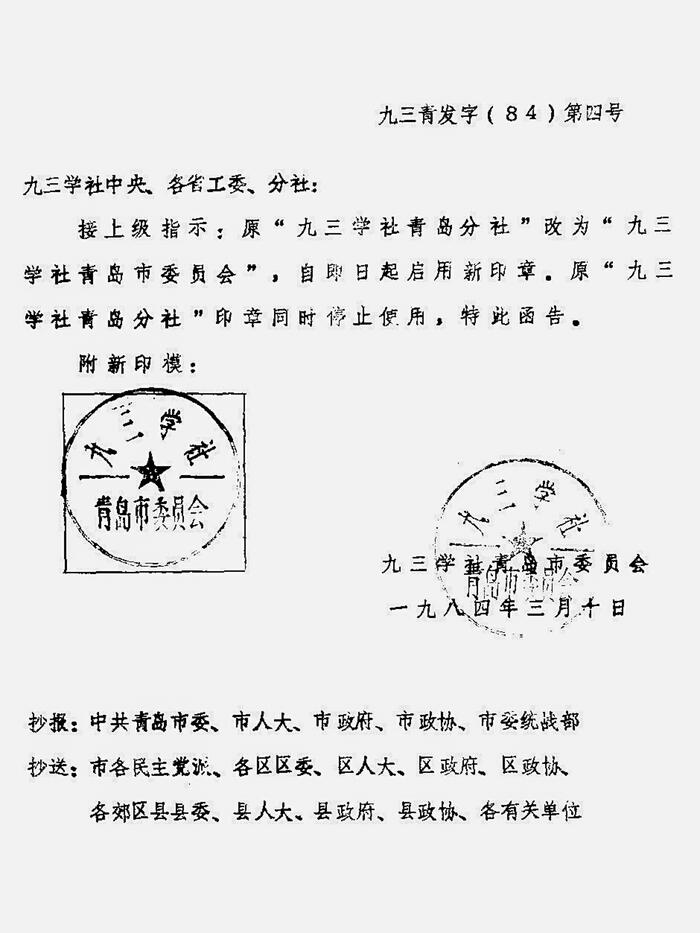 1984年3月10日,上报给社中央的文件(九三青发字《84》第四号)中提出,九三学社青岛分社更名为九三学社青岛市委员会。在文件中提到的“接上级指示”,应是刚成立不久的九三学社山东省工作委员会。这次名称的变更,也意味着隶属关系的变更,即九三学社青岛分社隶属九三学社中央;九三学社青岛市委员会隶属九三学社山东省委员会(九三学社青岛市委员会 王少韬 张俊杰)