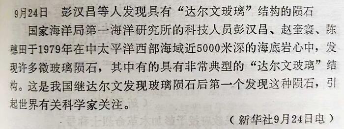 1981年9月24日,新华社报道,国家海洋局第一海洋研究所的科技人员彭汉昌(1982年5月在青岛加入九三学社)、赵奎寰、陈穗田于1979年在中太平洋西部海域近5000米深的海底岩心中,发现许多微玻璃陨石,其中有的具有非常典型的“达尔文玻璃”结构。这是我国继达尔文发现玻璃陨石后第一个发现这种陨石,引起世界有关科学家关注。