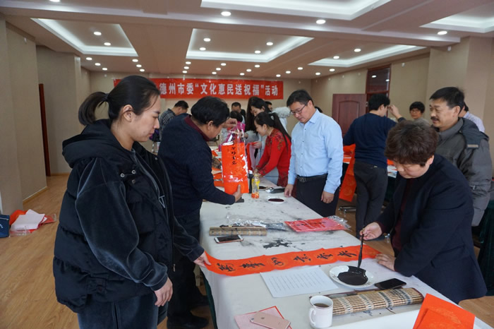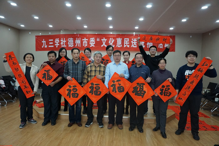 近日,九三学社德州市委组织社内外7名书法家到德城区广川街道办事处开展“文化惠民送祝福”活动。德州市政协常委、九三学社德州市委秘书长、德城区政协副主席戴连强参加活动。