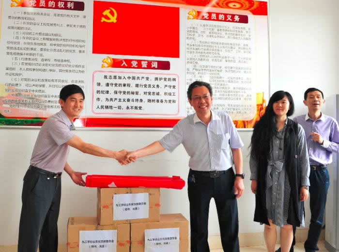 九三学社省文教委副主委周玉山与历城区彩石街道办事处党工委副书记于涛在捐赠文化礼包现场