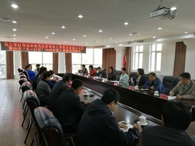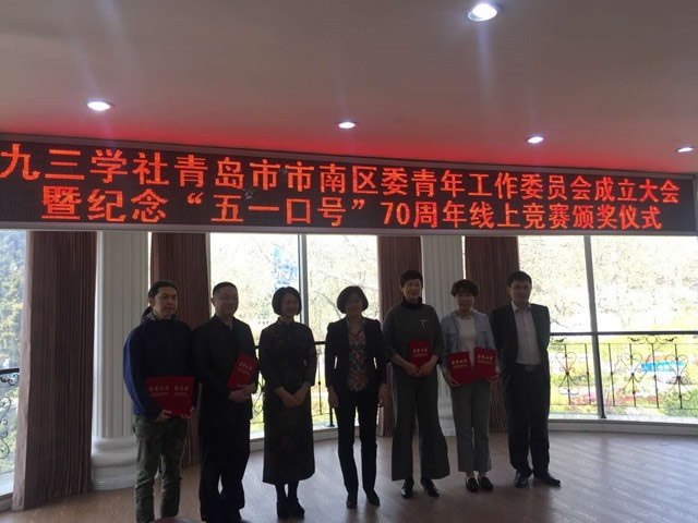 4月28日,九三学社青岛市市南区委员会成功举行纪念“五一口号”发布70周年知识竞赛颁奖仪式, 隆重召开九三学社市南区委青年工作委员会成立大会------向“五一口号”发布70周年献礼,并喜迎五四青年节。九三学社青岛市委驻会副主委于鹏、秘书长任红梅、副巡视员王均华应邀出席活动。会议由市南区委员会副主委吕海峰主持。市南区各支社委员会成员、青年工作委员会成员、青年社员、知识竞赛组织者与参赛人员参加本次活动。