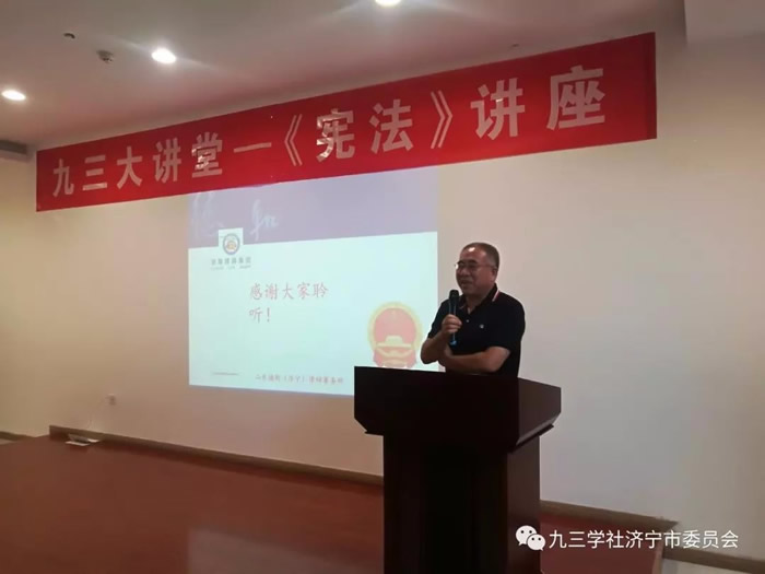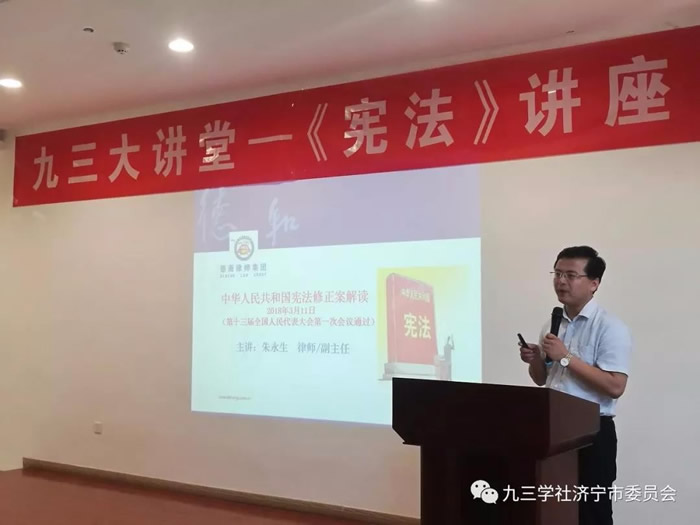 九三学社社员、青年律师朱永生为大家讲解了《宪法》。朱永生是山东德衡(济宁)律师事务所合伙人、副主任,山东省应对国际贸易摩擦律师服务团成员,济宁市人民政府法律顾问专家库成员,从事法律工作近十年来,办理了大量的民商事、刑事案件及重大非诉案件,在许多个案的诉讼代理上取得了丰硕成果。在本次讲座上,他充分发挥自己的专业特长,以通俗易懂的语言对宪法相关法条进行了解读,从宪法的产生与发展、第五次修改宪法的原因、宪法修正案的基本内容、重大意义等方面作了全面系统的阐述。社市委副主委刘要武讲解了九三学社第十一次全国代表大会修订的《九三学社章程》。