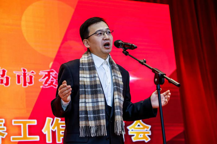 赵铁军主委作新年致辞。他首先代表九三学社青岛市委向各位来宾和全市社员致以诚挚问候和新春祝福!2018年,是社市委发展历程中具有深远影响的一年,也是全市基层组织和广大社员勇担使命、锐意进取的一年,在社省委和中共青岛市委的正确领导下,多项工作取得历史性的新突破,向社会各界交出了一份亮丽的成绩单:紧紧抓住经济社会中具有全局性、战略性、前瞻性的重大问题,深入调查研究,建真言,出实招,6项成果得到中央、省、市等各级领导批示, 8篇建议分别被中央统战部和全国政协采用,参政议政工作取得前所未有的突破;以建设高素质参政党地方组织为目标,组织建设健康有序,领导班子务实创新,思想宣传卓有成效,各项工作都取得了新成绩,组织活力和凝聚力不断增强;发挥优势突出特色,社会服务注重实效,积极服务全市精准扶贫、乡村振兴、社区共建工作大局,扎实推进“同心九三系列行”等品牌工作,成效显著,为助推全市经济社会发展做出了应有的贡献。2019年,社市委将以更加强烈的历史担当和勇往直前的奋斗精神,团结带领全市广大社员为谱写新时代青岛改革发展新篇章贡献智慧和力量,向新中国成立70周年献礼!