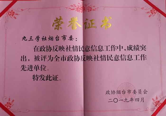 九三学社烟台市委被烟台市政协评为信息工作先进单位