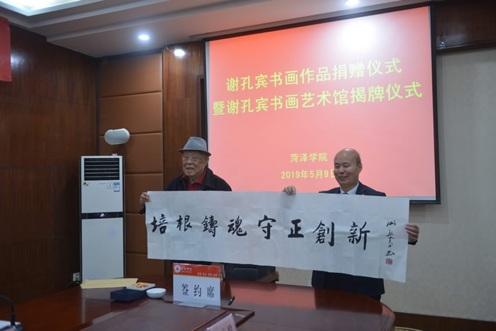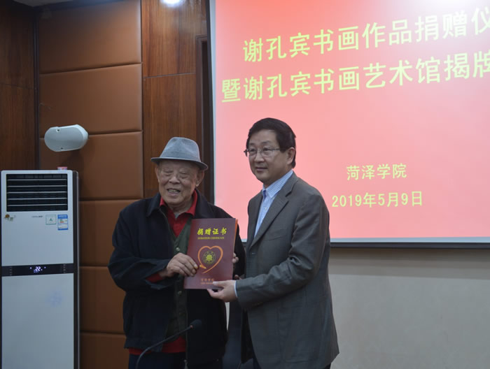 2019年5月9日,九三学社社员谢孔宾教授书画作品捐赠仪式暨谢孔宾教授书画艺术馆揭牌仪式在菏泽学院举行。