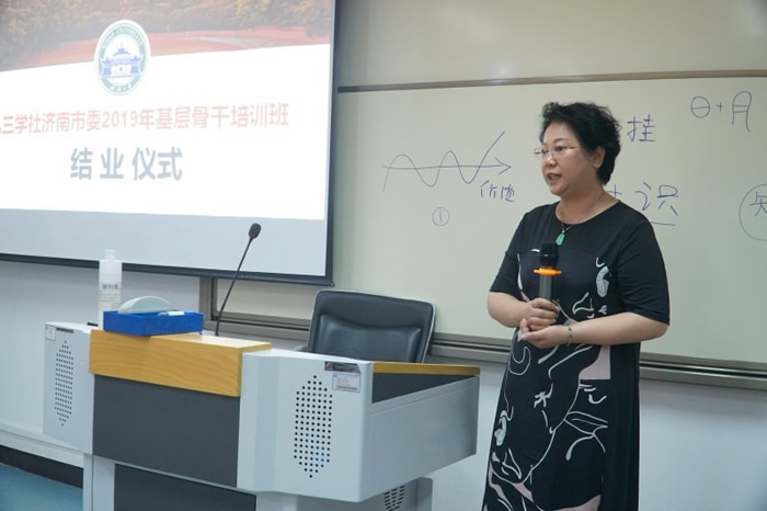 在结业式上,九三学社济南市委二级巡视员陈宁宁指出,这次培训班筹备工作周密、内容丰富合理、学习效果显著。她要求大家一是提高政治站位,夯实共同思想政治基础;二是坚持学以致用,积极履行参政党职能。三是认真抓好落实,推动主题教育活动深入开展。要以此次培训班为契机,勤奋学习、扎实工作,继续发挥好骨干成员的作用,以更加积极的态度和更加饱满的精神,将所学所获运用到实际工作和九三学社事业发展中去,推动全社各项工作再上一个新台阶,为推动我市建设“大强美富通”现代化国际大都市的任务目标贡献智慧和力量。