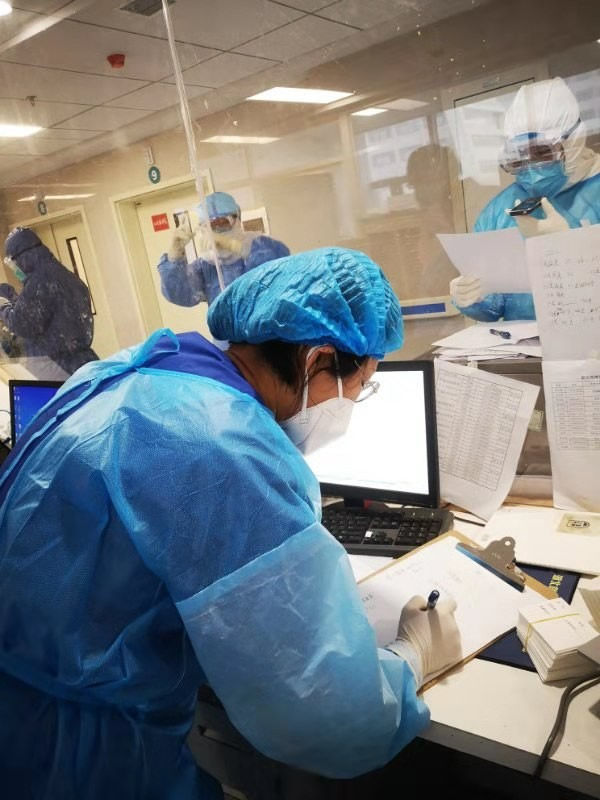 1月29日5:45,吕纪玲得知自己被安排上早班,瞬间睡意全无。“我来了,终于可以上战场了!”而短时间内收治大量病人,吕纪玲和队员们除了做好相关收治工作,还要完善大量的医疗文书。队员们三人一组,从早上八点上到下午两点轮流进入病区,不进入病区的人负责在外面写病历直到换岗。为了尽量节省时间、节约物资,吕纪玲和队员们在训练的时候就达成了共识——“能少喝水就少喝水,尽量减少防护服的穿脱次数。”为此队员们都自备了成人纸尿裤,节约一切时间用来救助患者。