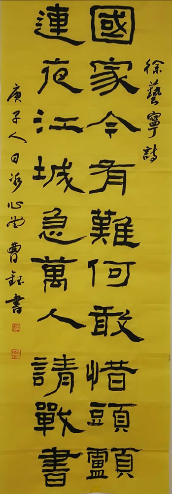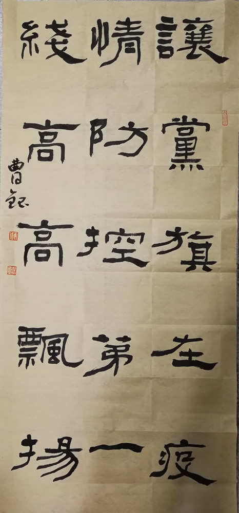 “我们共有一个家,名字叫中国”、“国家有难,匹夫有责”。在新型冠状病毒肺炎疫情肆虐之时,九三学社菏泽市直五支社主委曹钰是这样想的,也是这样做的。作为菏泽市书协主席、山东省政协委员、中国书协会员、山东省书协副主席,曹钰主委在知天命之年,为支持抗疫倾情投入着身力和心力。