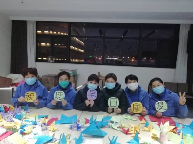 我所在的医护组,在组长和护士长带领下,开展了各种形式的病区文化活动。我们组的战友们大都是孩子家长,平时在家帮着孩子做手工作业,练就了一手手工活儿。在方舱医院,我们这个优势就充分发挥出来了。我们利用有限的物资,挤出时间裁纸、折千纸鹤、做手工,并在上面写上祝福和加油打气的话。墙上、拐角、床边,都有我们的手工活儿。这样的元素加入后,原本肃静的病区,顿时变得充满温暖和爱意。很多患者纷纷在卡片上写下留言:“谢谢山东!武汉加油!我们必胜!”让人看了非常感动。很多患者还跑过来和我们拍照留念,脸上洋溢着真诚的笑容。