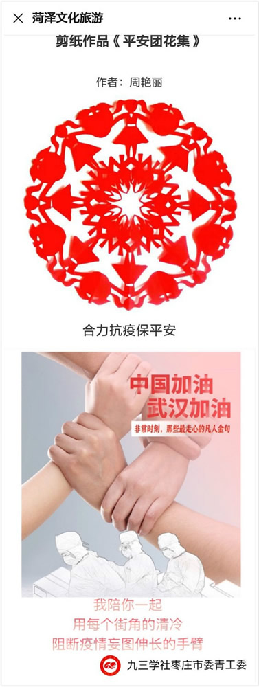 菏泽青工委共收到近44篇抗击疫情方面的社情民意信息,涉及对疫情阻断、监测、对医护人员的防护等方面,被社省委采用5篇,被市长批示2篇,为政府科学决策提供了有力参考。青工委委员张伟杰、张雁、周艳丽等人还积极为抗疫创作书法、歌曲、剪纸作品,通过抖音号、微信公众号等传递众志成城的抗疫斗志和平安祈愿。
