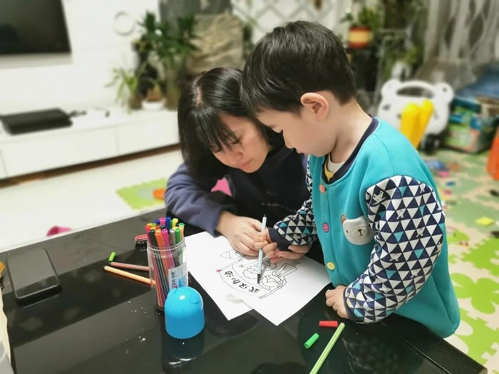 (三岁的李博岩小朋友在妈妈的帮助下,为《武汉加油》这幅画涂色)