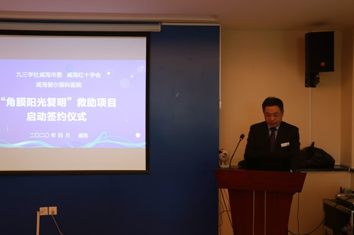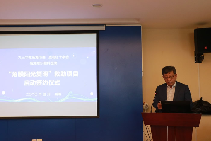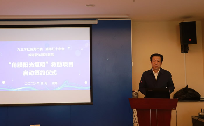九三学社威海市委主委贾国哲在讲话中指出,今年是全面建成小康社会和“十三五”规划的收官之年,也是九三学社创建75周年,九三学社威海市委牢记服务社会的宗旨,积极投身助力脱贫攻坚,九三学社威海市委、威海市红十字会、威海爱尔眼科医院联合启动的2020年“角膜阳光复明”救助项目,将帮助我市20名因角膜疾患致盲的患者重获光明,为20个贫困家庭带来生活的希望。九三学社威海市委将持续关注和加强与威海各界的联合,凝心聚力,为加快建设“精致城市·幸福威海”而共同努力!