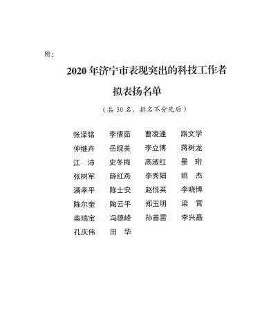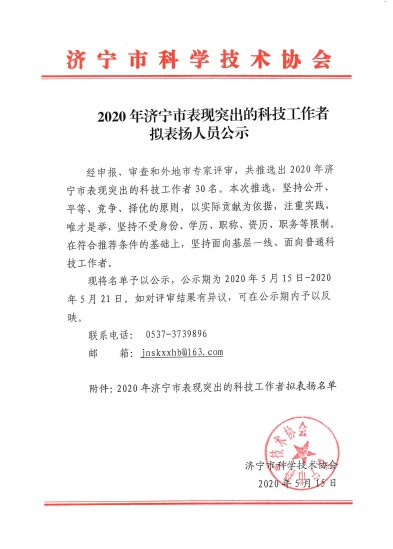 近日,济宁市科学技术协会对2020年济宁市表现突出的科技工作者拟表扬人员(共30人)进行公示,济宁九三学社史冬梅、蒋树龙、李秀娟3名社员入选。