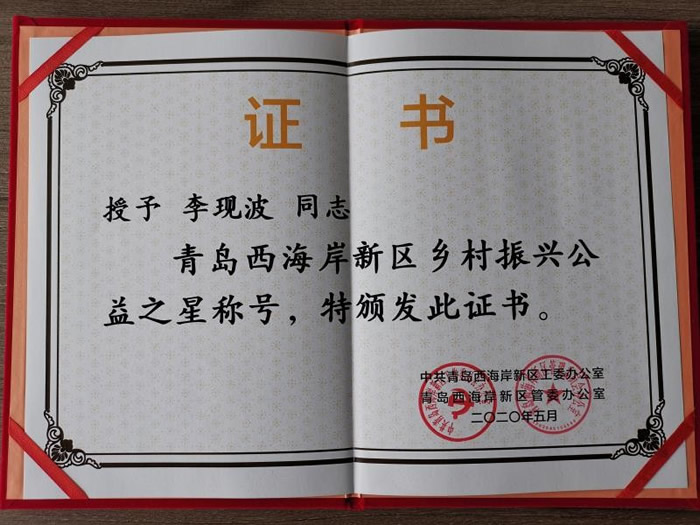 在2020年5月22日召开的青岛西海岸新区乡村振兴工作队2019年度总结暨新一轮选派动员部署会上,李现波被评选为青岛西海岸新区乡村振兴公益之星。