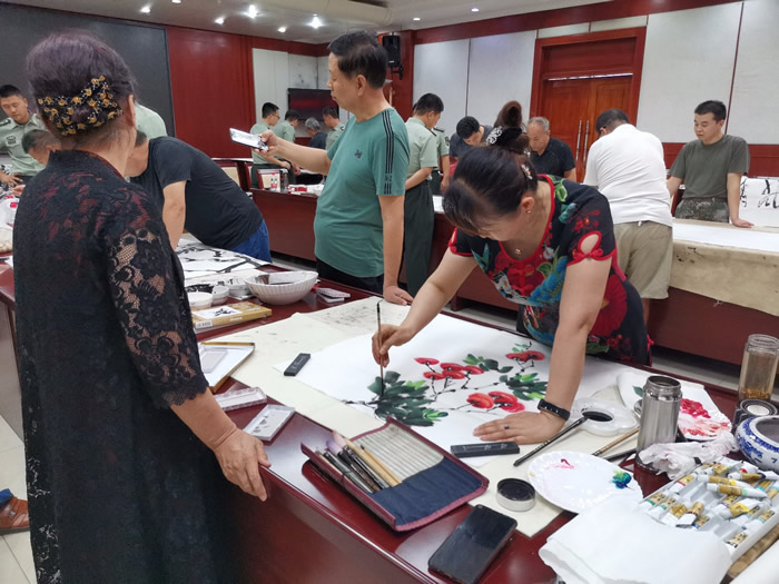 12名书画家挥毫拔墨,现场精心创作了60多幅书法、国画等作品,献给最可爱的人,丰富了军地之间的精神文化生活,巩固了双拥共建工作的成果,也为在酷暑中的军营增添了一丝清凉。(九三学社德州市委 关燕)