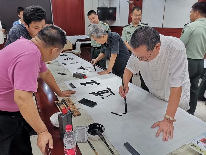 7月31日下午,九三学社德州市委、中共德城区委统战部联合组织12名书画家到德州市陆军预备役后勤保障旅开展“庆八一·送书画进军营”活动,市人大常委会副主任、九三学社德州市委主委钟玲参加活动。