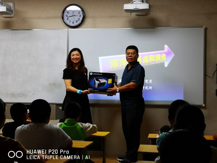 共建仪式结束后,九三学社青岛市委青工委副主任张国良教授为6年级小学生做了题为《海洋奇缘》的科普讲座,他借用生活中的鸡蛋向大家介绍地球的结构,让同学们对地幔、地壳、地核有了形象认知;张教授还对大陆漂移和海底扩张基础上建立的板块构造理论形成历史作了详细讲解;同时也介绍了奇妙的海底世界,既有各种高温流体,也有特殊的生命环境和丰富的海底资源。张教授在讲座的过程中与同学们轻松互动,激发他们去求知去探索,关心海洋,认识海洋,并在将来经略海洋,同学们的提问更是让讲座掀起了高潮。