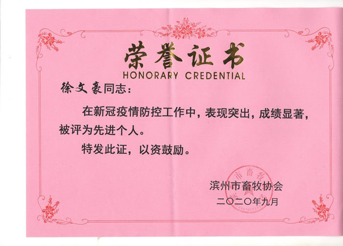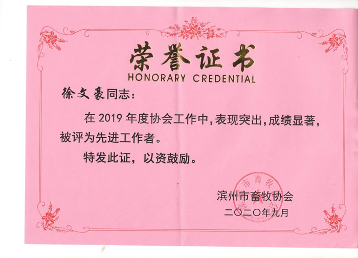 滨州市九三学社社员徐文豪获“滨州市畜牧协会先进工作者和疫情防控先进个人”荣誉称号