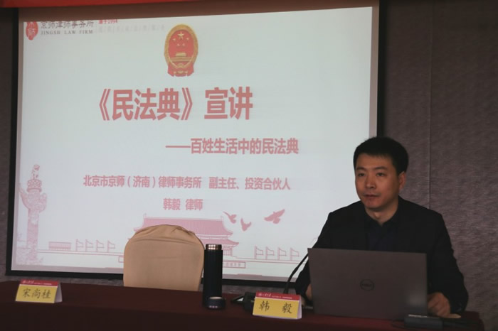 会议邀请九三学社山东省委青工委副主任,北京市京师(济南)律师事务所副主任、投资合伙人韩毅就《民法典》为大家授课。