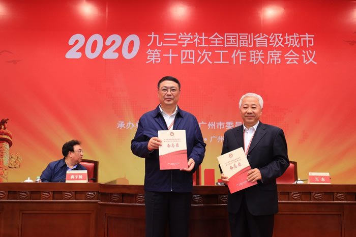 赵铁军主委从九三学社广州市委主委王东手中接过备忘录并致邀请辞,九三学社青岛市委将主办2021年九三学社全国副省级城市第十五次工作联席会议。(九三学社青岛市委 朱松君)